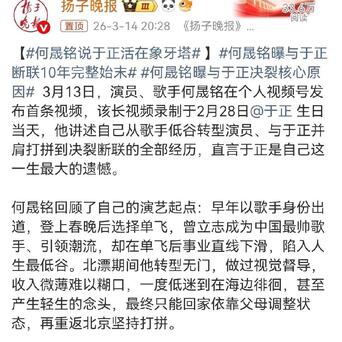 近日,何晟铭在网上发了一条视频,谈他和于正决裂的过程和原因,他强调这条视频是在于正生日当天录制的,他还说于正是自己这一生最大的遗憾。