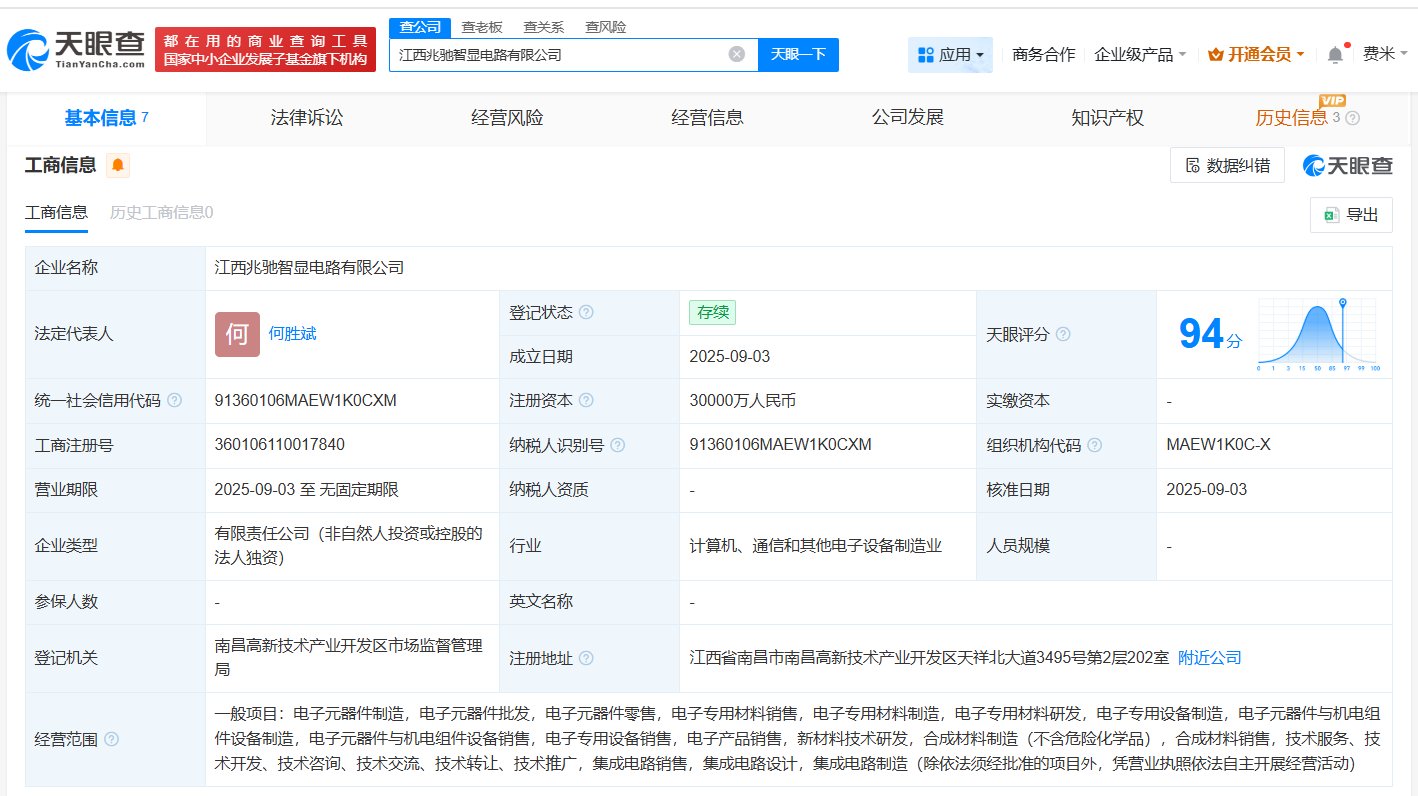 天眼查工商信息显示,近日,江西兆驰智显电路有限公司成立,法定代表人为何胜斌第一配资门户,注册资本3亿人民币,经营范围包括电子元器件制造、电子元器件批发、电子元器件零售等。股东信息显示第一配资门户,该公司由兆驰股份(002429)旗下江西兆驰晶显有限公司全资持股。